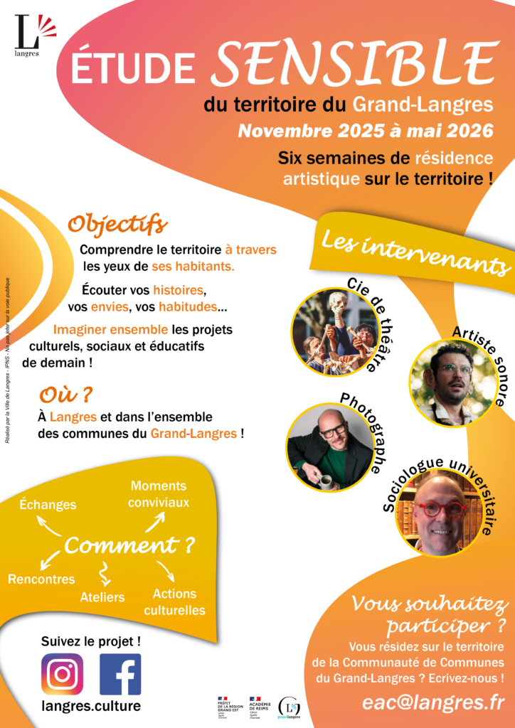 Une étude sensible est lancée, portée par la Ville de Langres avec le soutien financier de la DRAC Grand Est, et en partenariat avec l’Académie de Reims et la Communauté de communes du Grand-Langres, pour écouter et raconter le territoire autrement, grâce au regard croisé d’artistes et d’un sociologue. De novembre 2025 à février 2026, cette démarche artistique et participative fera émerger paroles, images et sons du quotidien des habitants, avant une restitution publique courant 2026.