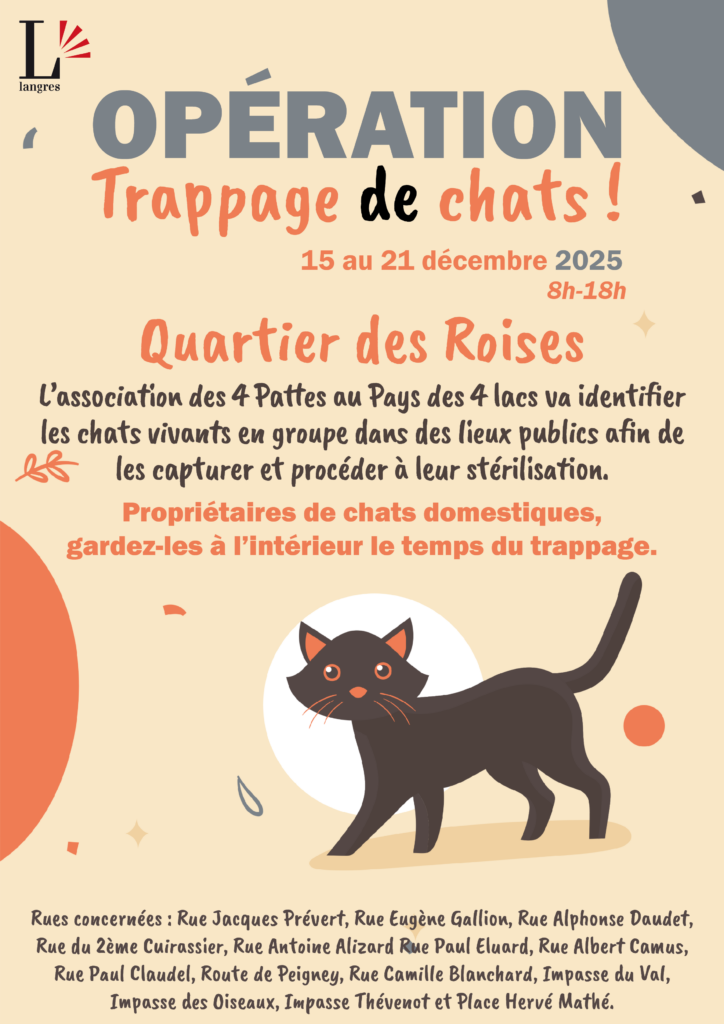 son opération de trappage de chats errants au niveau du quartier des Roises afin de procéder à leur identification et stérilisation. Si vous êtes propriétaires de chats domestiques, veillez à bien les garder à l’intérieur du domicile